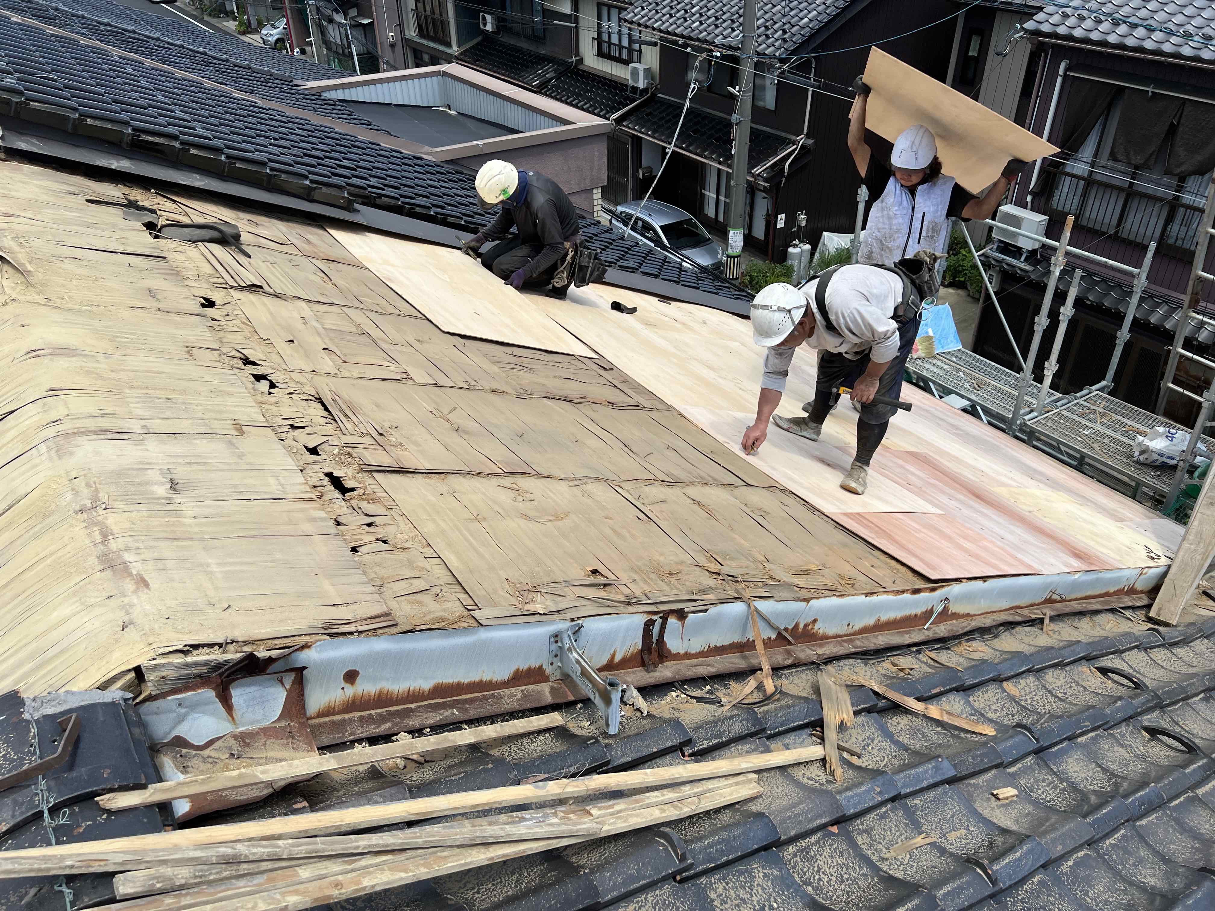 屋根は下地が肝心です。下地材となる野地板を張替え「ルーフィング」という屋根の防水シートを施工していきました。