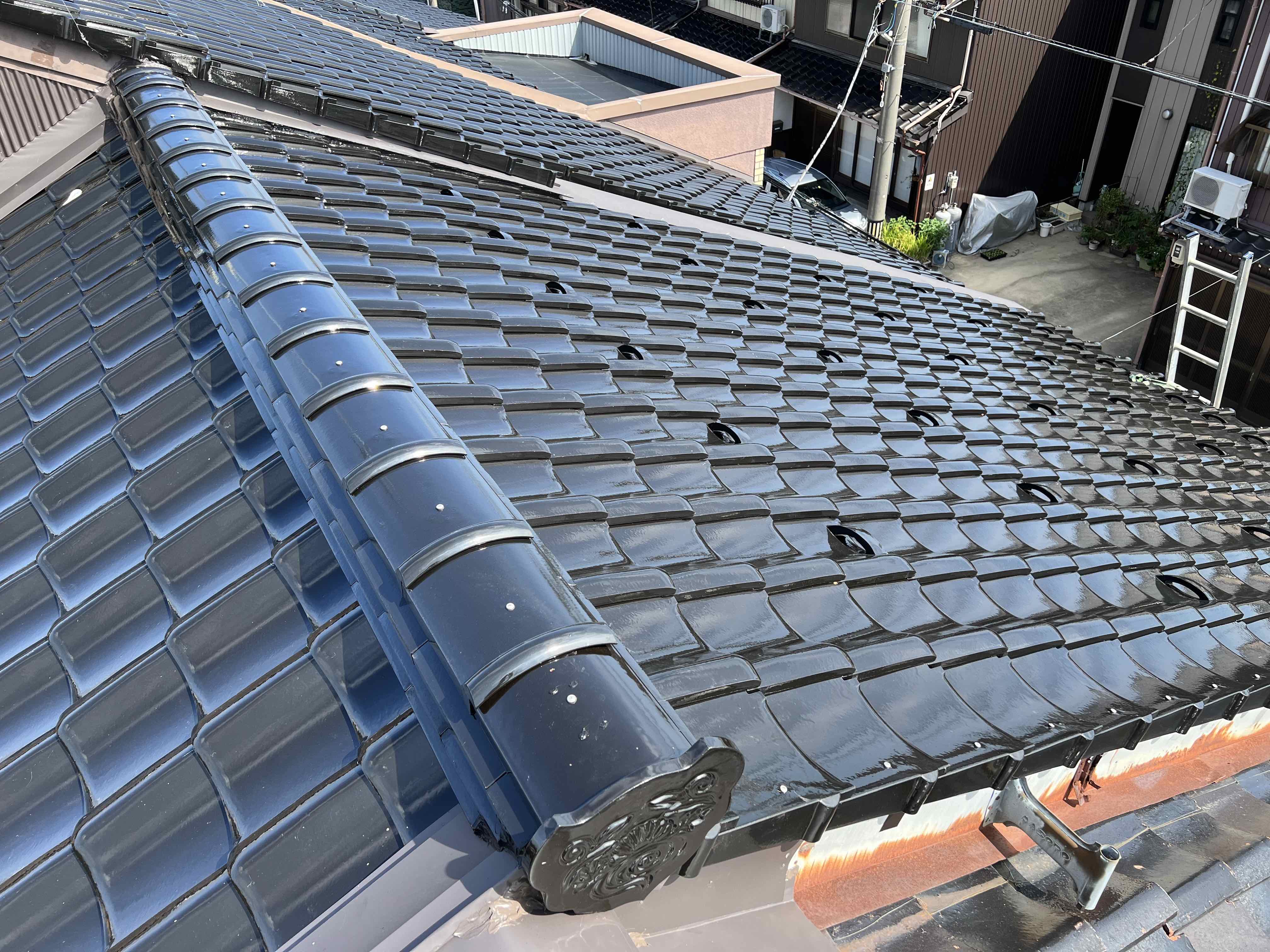 既存の瓦屋根は経年による色褪せ、浮き、ズレ、破損などが見受けられました。板金部分も錆びもありましたので、付隣の屋根との取り合いに注意しながら板金の取替と瓦屋根の葺き替えを行っていきました。