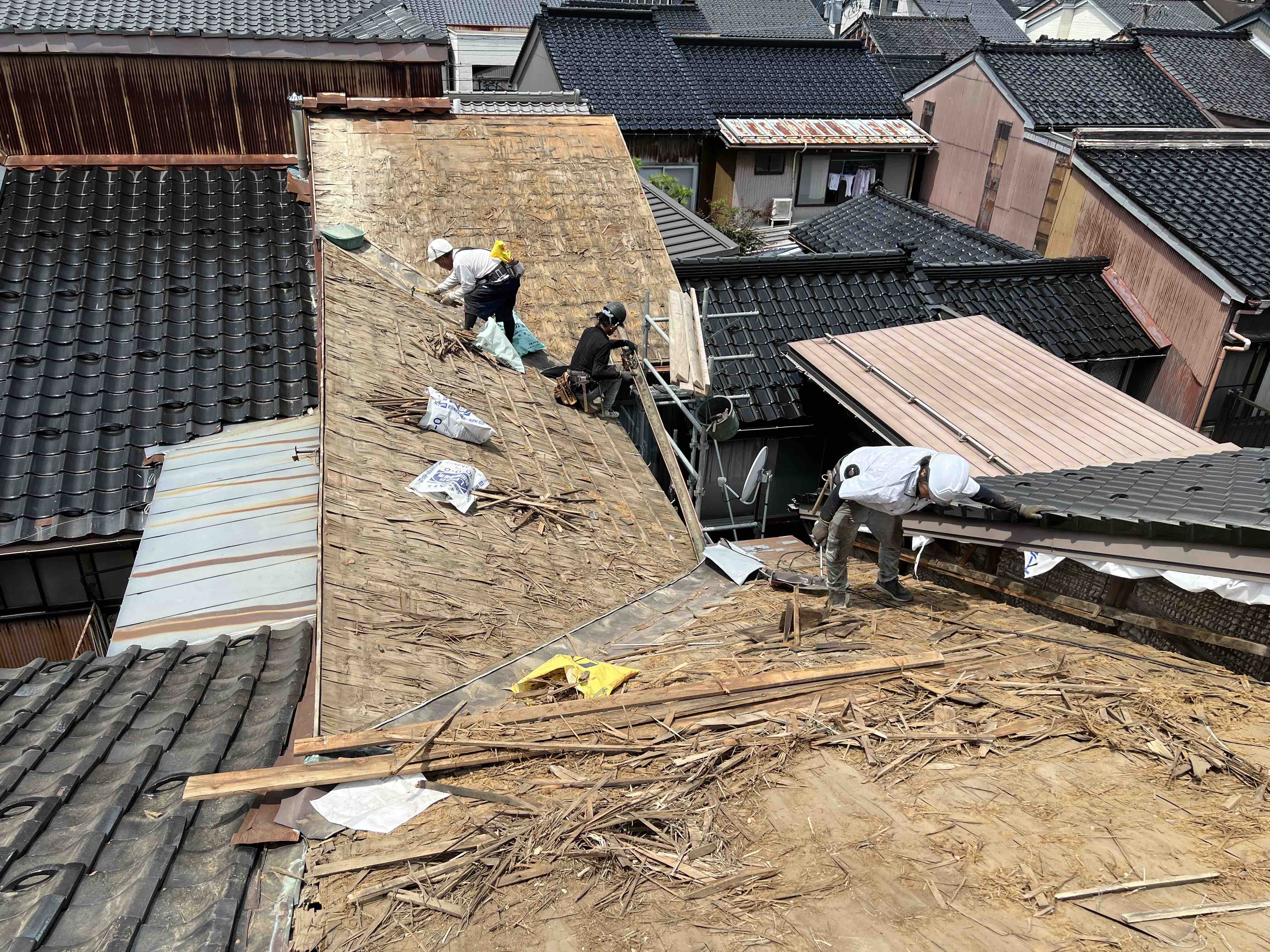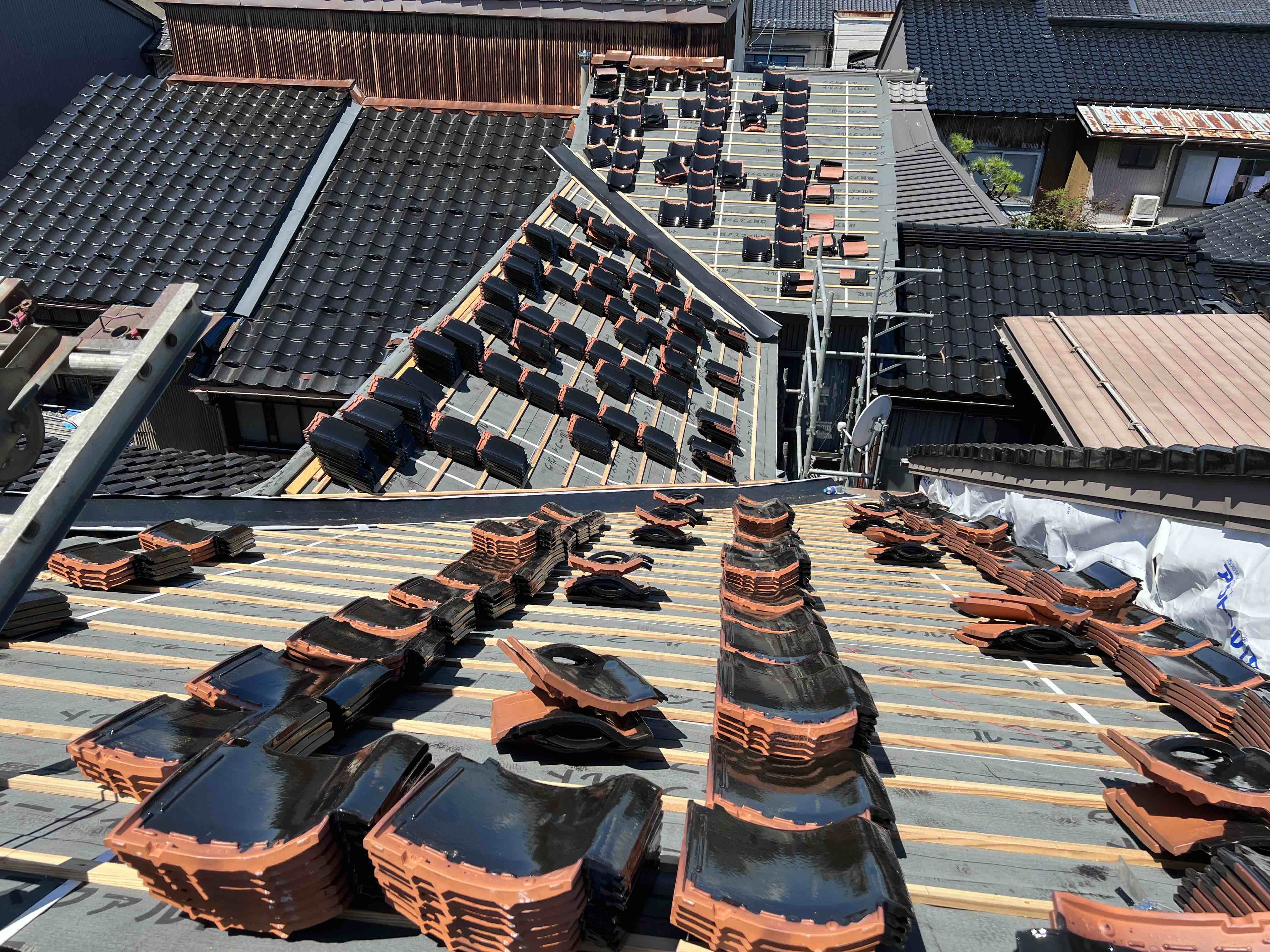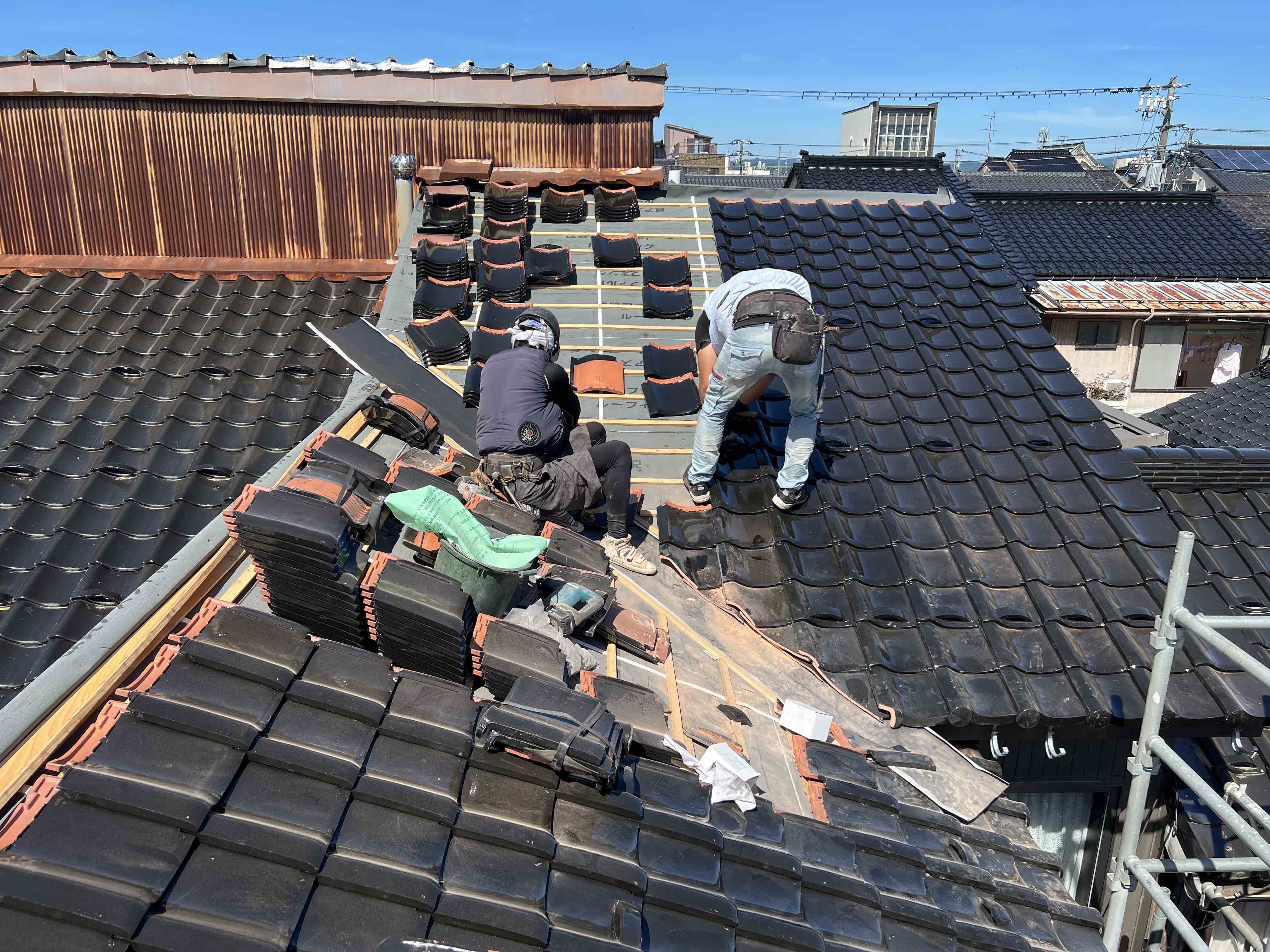 町屋の屋根を上から見下ろす機会ってなかなかないですよね。まずは、既存の瓦を撤去していきます。