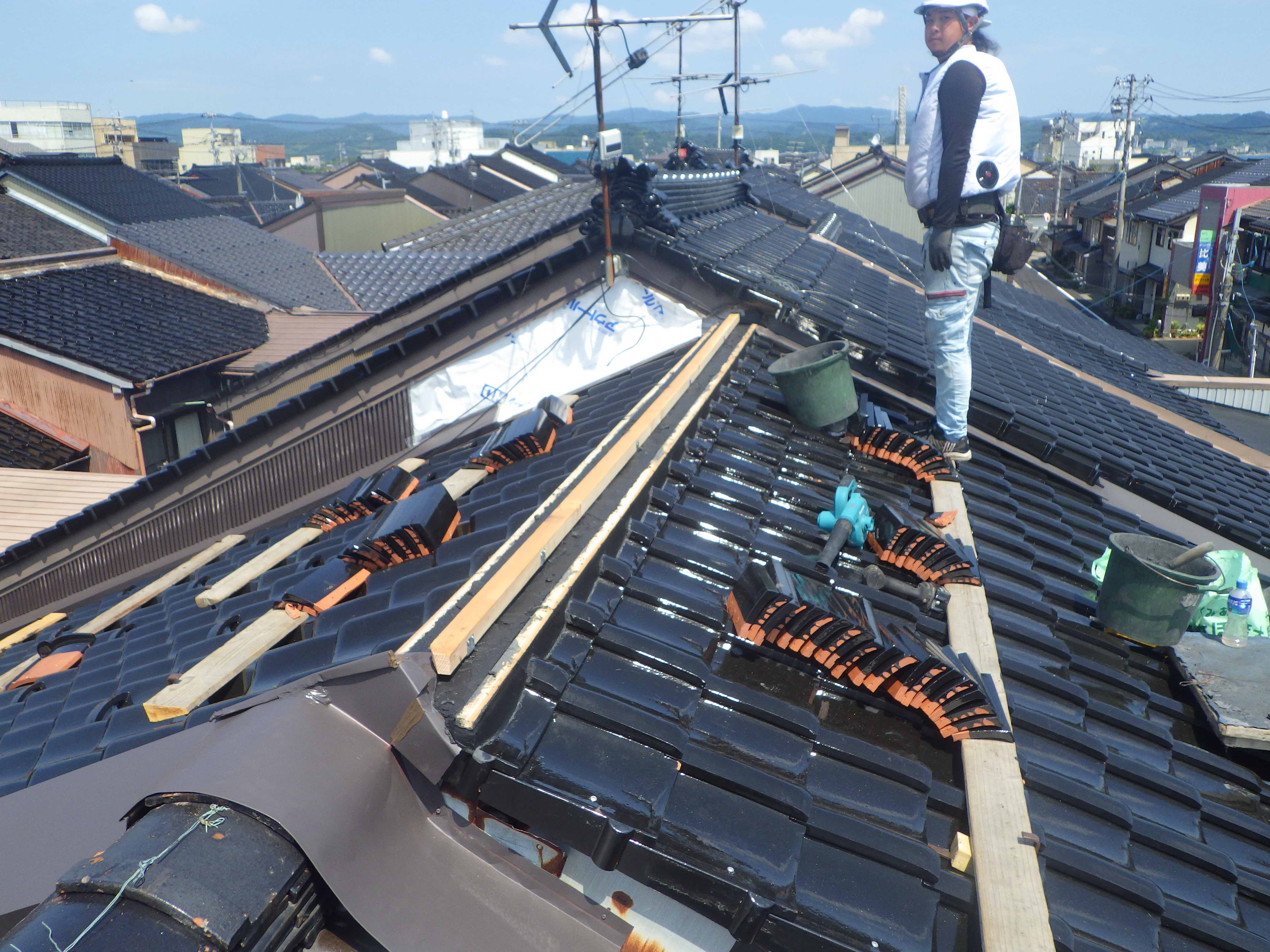 棟瓦は屋根の中でも比較的傷みやすい部位で、棟瓦の劣化を放っておくと、雨漏りにつながります。今回のリフォームで棟瓦の補修も行っていきました。