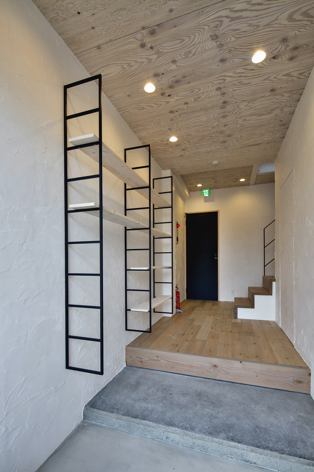 2階のエントランスには、はしご状のアイアンで収納を造作しました。板の高さが自由に変えられるので便利です。