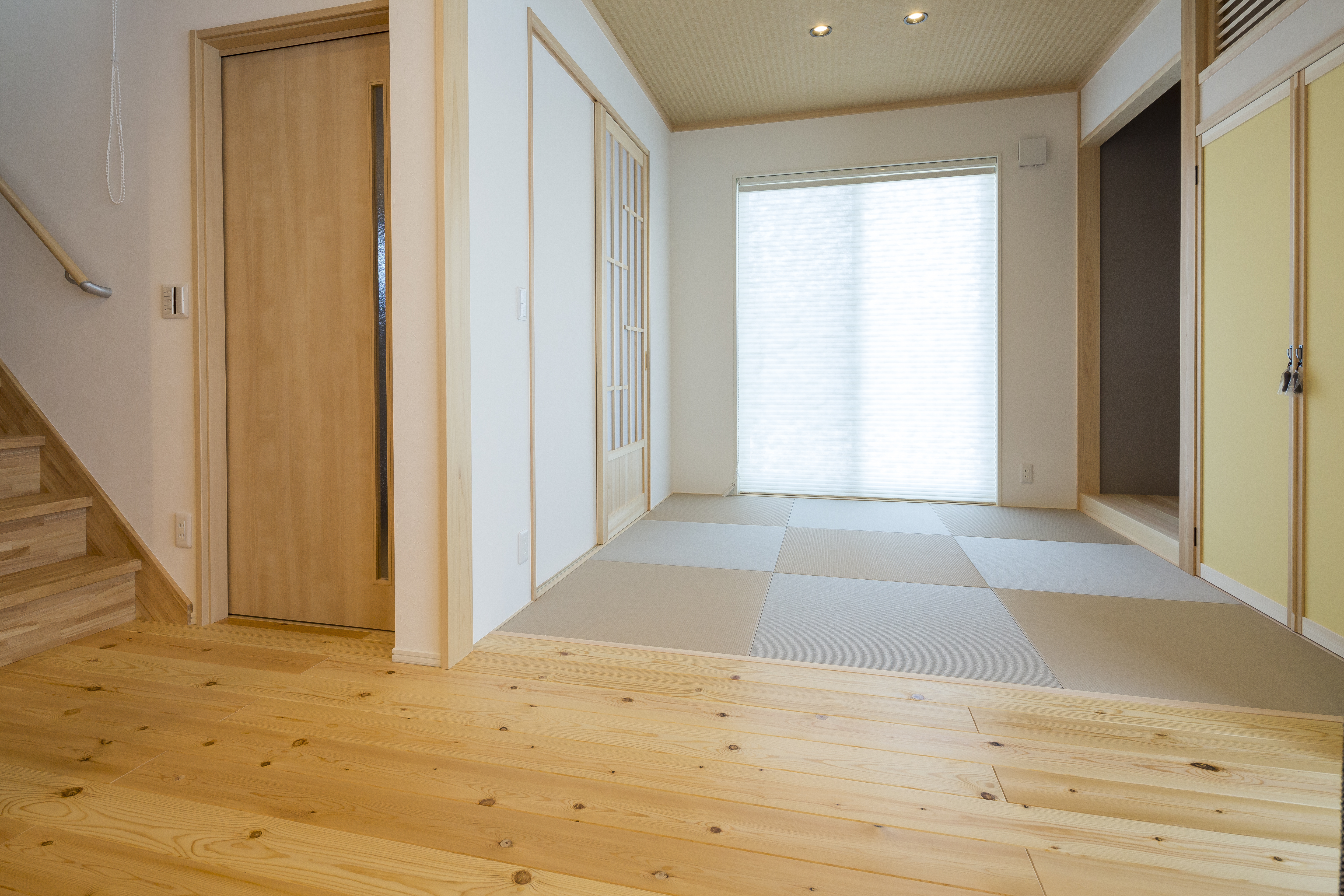 LDKから広がる和室は、玄関からも直接入れるよう設計しました。襖で仕切れば個室となり、急な来客もスマートにお通しできます。和紙調のロールスクリーンからはやさしい日差しが差し込みます。