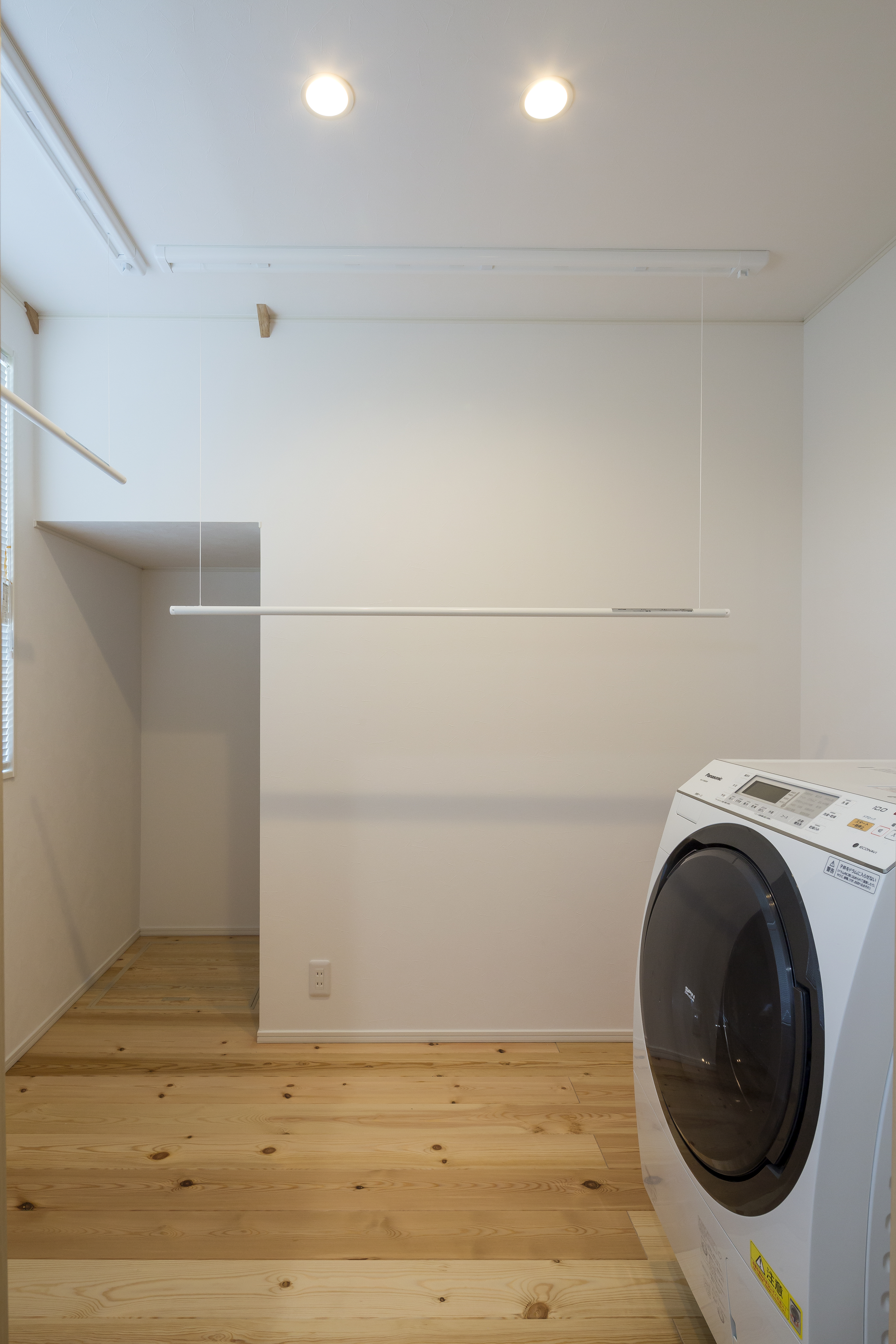K様のご要望にあわせ、ランドリールームを設けました。室内干しポールは手動で高さを変えられます。収納スペースを設けているので、乾いた衣類をそのまま衣類ケースにしまっていただけます。床はもちろん無垢材で♪