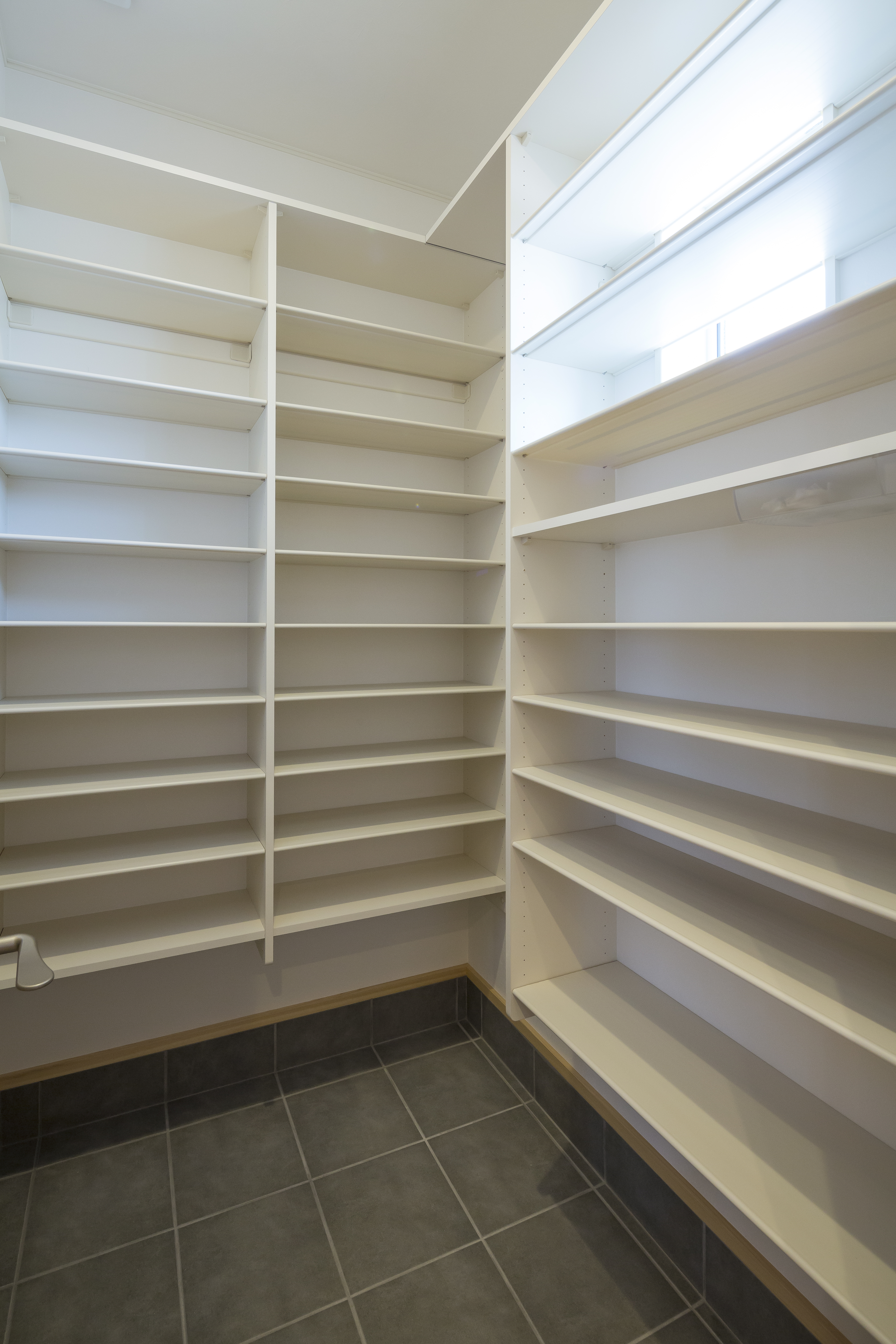 スニーカーや靴がお好きなK様。玄関の土間から広がる大容量のシューズクロークをつくりました。ゴルフバッグなど大きな荷物もしまえて便利です。収納には採光や通気性を考えて窓を付けています。