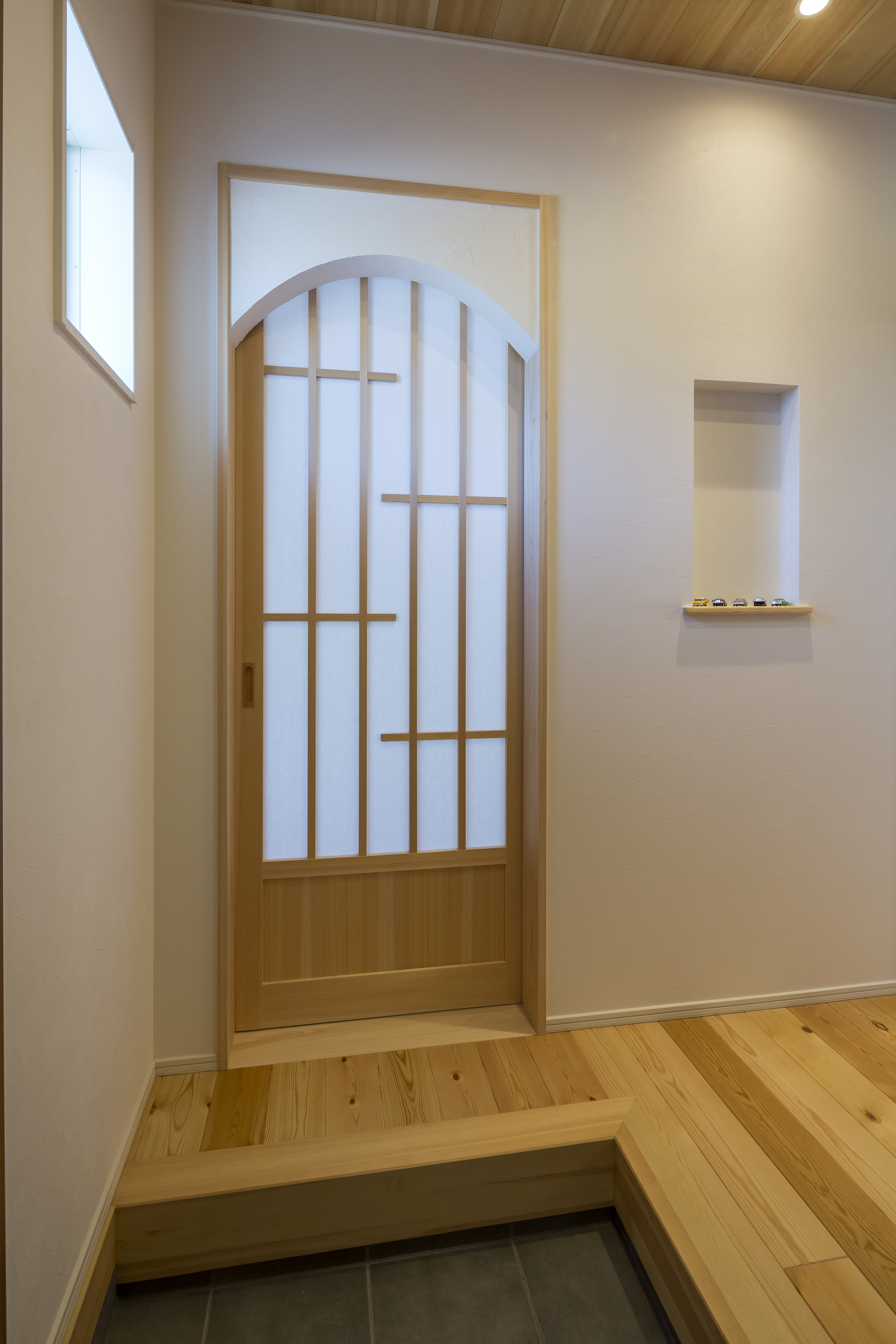 玄関横に小さな上がり框をつけ、直接入れる和室をご用意しました。リビング(生活空間)を通さずに、ゲストをお通しできる設計です。Rの入り口と和風のデザインがオシャレな引き戸で仕上げていきました。「おもてなし」の心を表現しています。