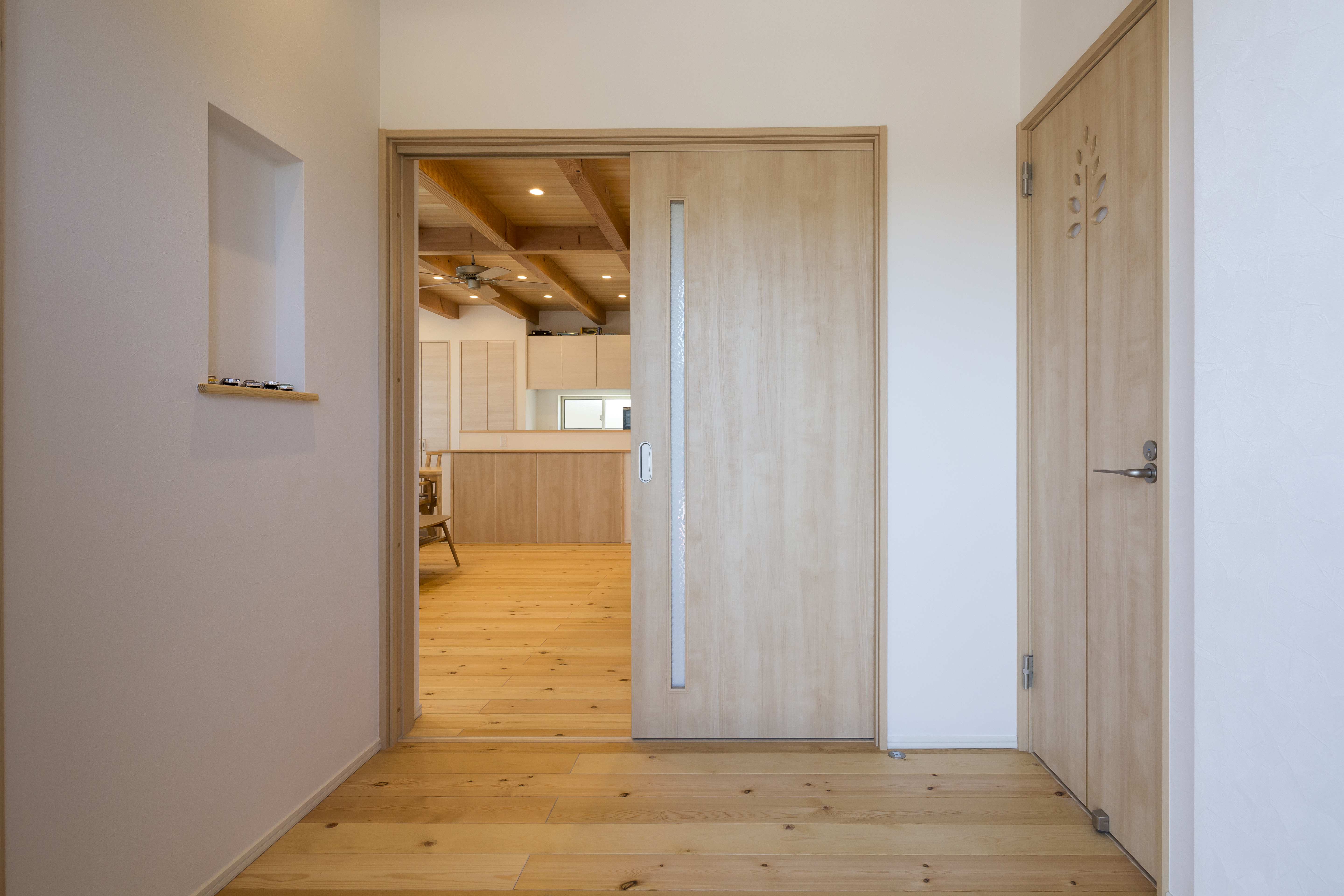 キッチンカウンターや建具にも無垢材を使用。壁面収納の一角に神棚をご用意しています。
