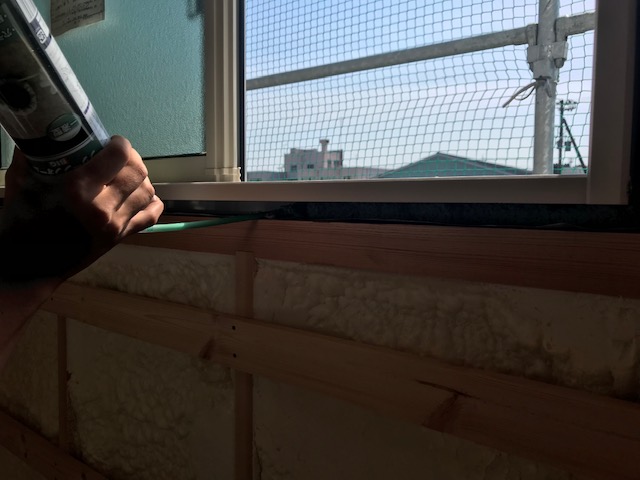 窓枠周りの隙間にも丁寧に断熱材を詰めていきます。