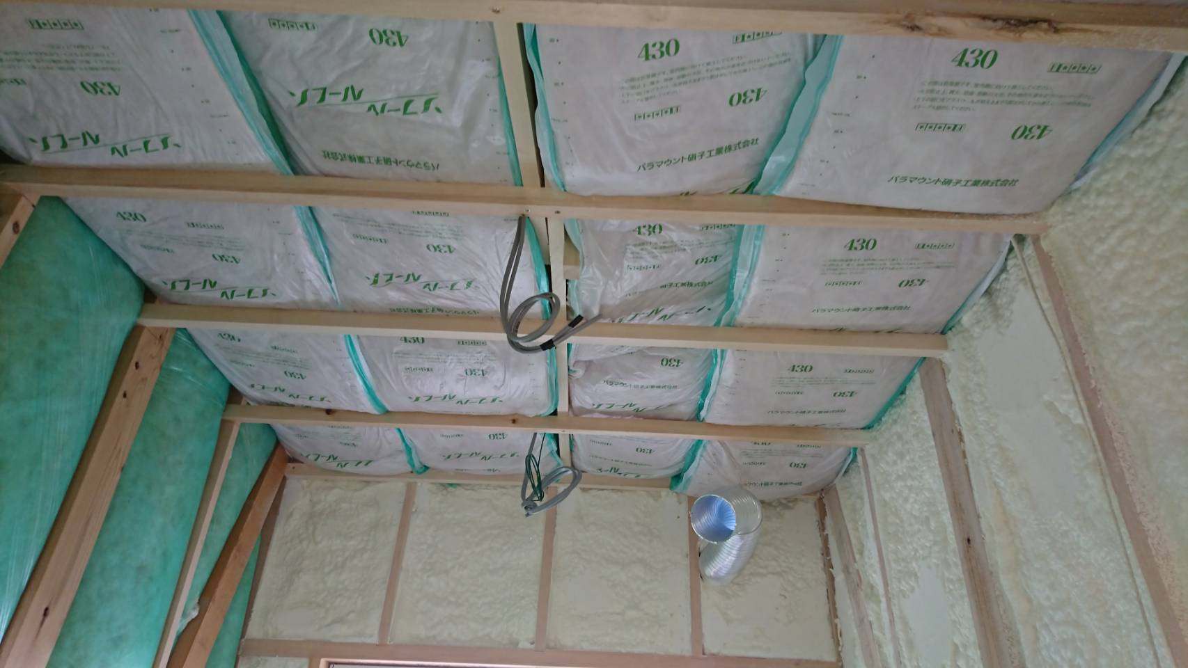 壁と天井に断熱材を敷き詰めます。外壁である奥と右の壁には高性能のウレタンを、左側の内壁にはグラスウールを採用しました。通常内壁にまでは施工しませんが、今回は断熱性能を高めるために使用しました。天井にはグラスウールをしっかりと詰めました。