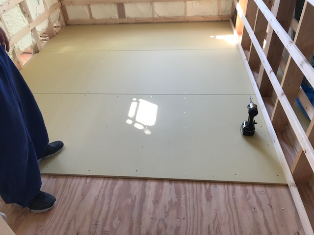 2階の床には合板の上にプラスターボードを施工し、防音効果も高めています。