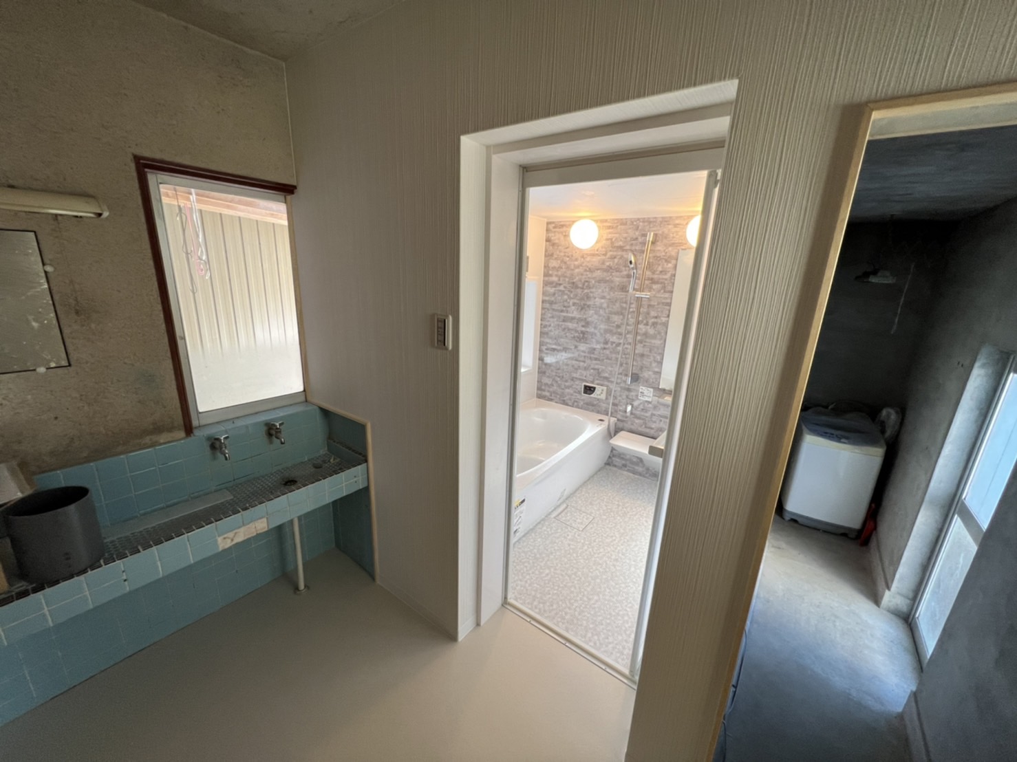 洗面所と浴室の間の壁を一旦壊し、開口の位置を変更し間口を広げました。また、新しくクロスを貼った部分に、「見切り材」と呼ばれる表面に使う仕上げ材を施工。デザインにもこだわりました。