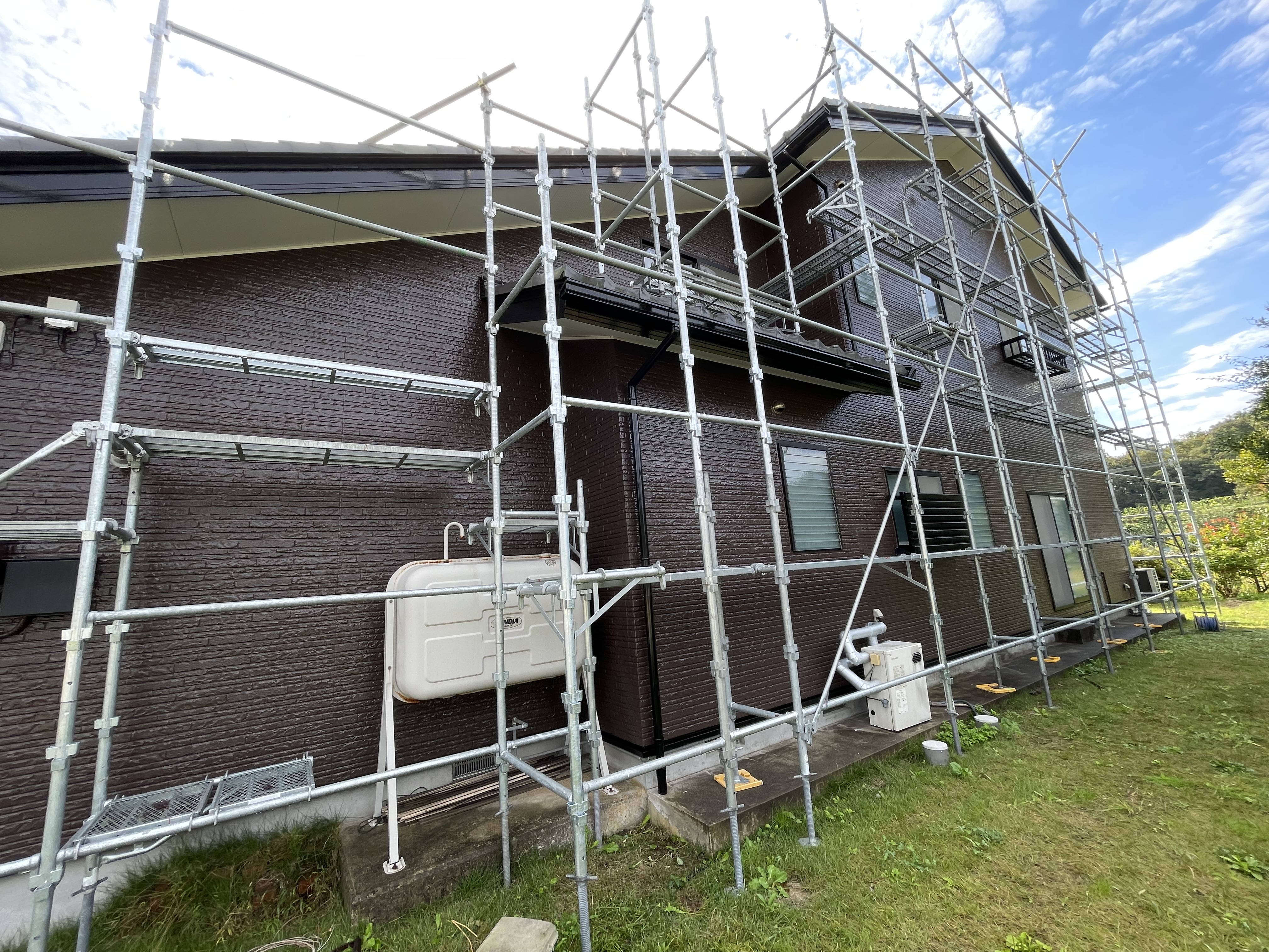 富山県氷見市の外壁塗装リフォームの施工事例/施工中/足場