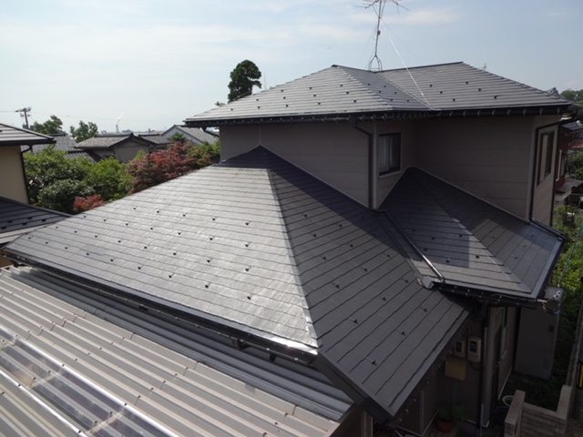 既存の屋根の一部を補修し、洗浄を入念に行いました。採用した塗料は、耐候性の高い「スーパームキコートルーフ」です。新築のような仕上がりです。