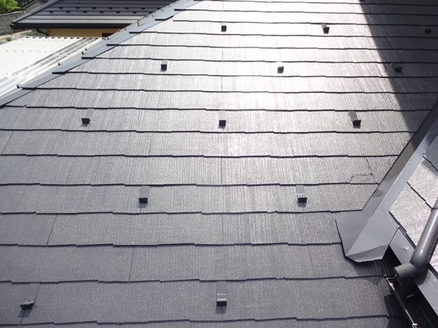 スレート屋根特有のすき間を活用する「タスペーサー」を再設置し、キレイに塗装で仕上げていきました。